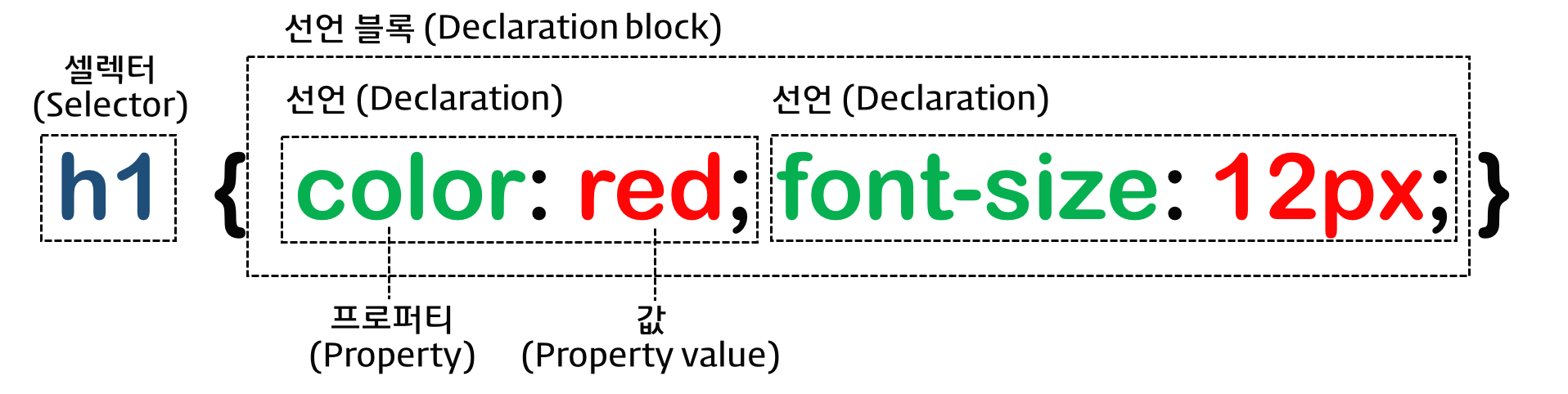 - Rule set의 선택자(selector)는 html문서의 특정 요소(element)를 참조한 다음, 그 요소에 선언 블록(declaration block)에 해당하는 내용을 적용시켜준다.